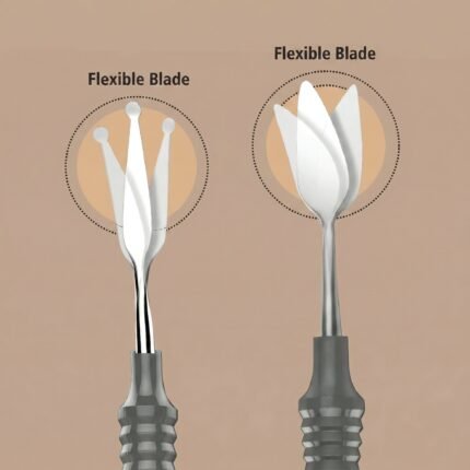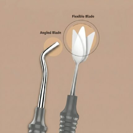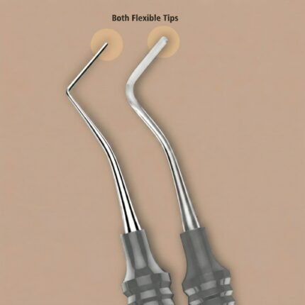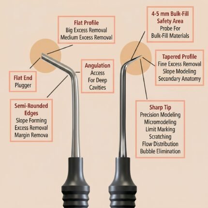 Dual-ended composite instrument combining flexible curved and angled blades, designed for precise sculpting and contouring in anterior restorations.