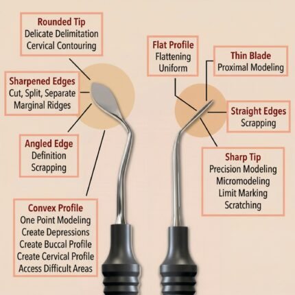 Dual-ended dental instrument with flexible blades, designed for precise sculpting and contouring of micro-fill composites in anterior restorations.