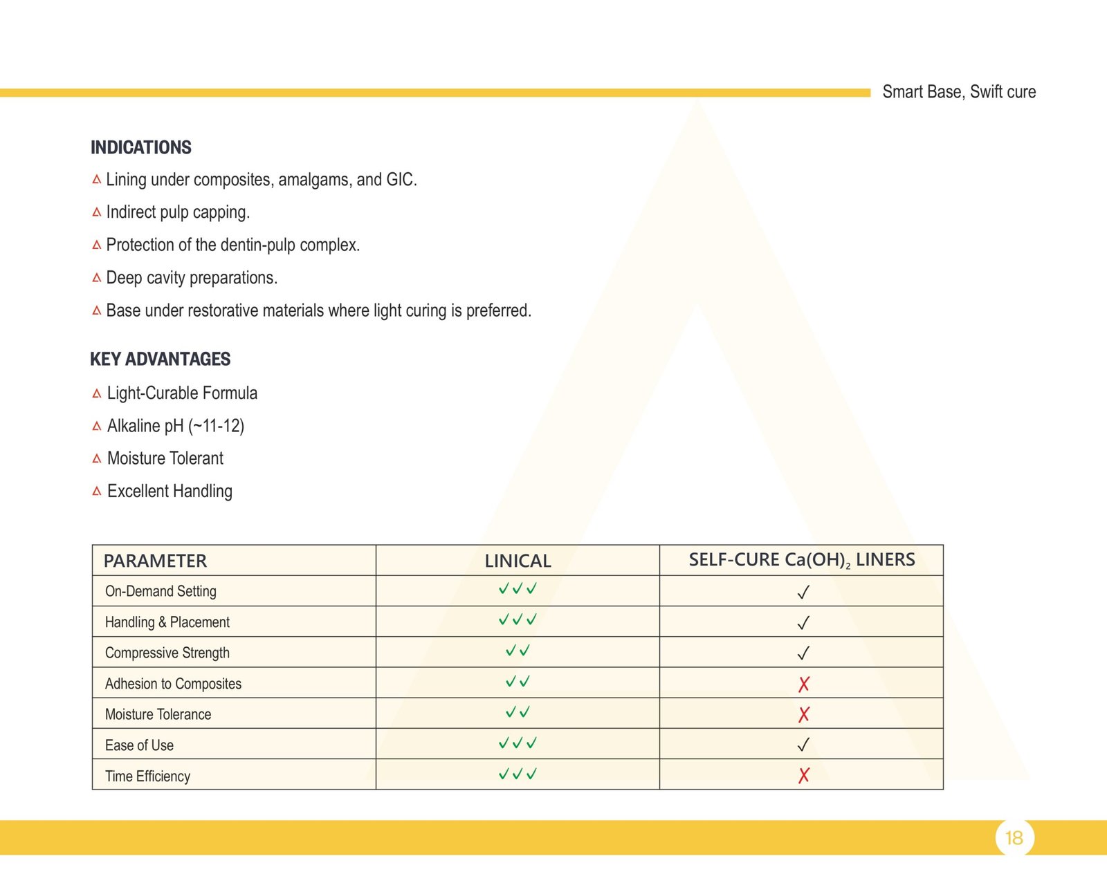 The liner features an alkaline pH (approximately 11โ12), which supports pulp vitality and promotes reparative dentin formation. Its light-curable formulation allows on-demand setting, giving clinicians full control over working time and placement. LINICAL exhibits excellent handling characteristics, moisture tolerance, and strong compressive strength, ensuring stability under restorative materials.